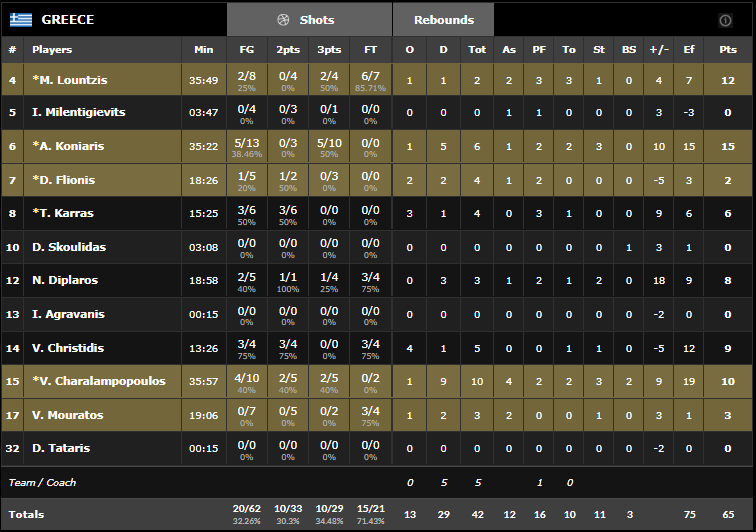 ΕΛΛΑΔΑ (Παπαθεοδώρου): Λούντζης 12 (2), Μιλεντίγιεβιτς, Κόνιαρης 15 (5 τρίπ., 6 ριμπ.), Φλιώνης 2, Καρράς 6, Σκουλίδας, Δίπλαρος 8 (1), Αγραβάνης, Χρηστίδης 9, Χαραλαμπόπουλος 10 (2 τρίπ., 10 ριμπ.), Μουράτος 3, Τάταρης.