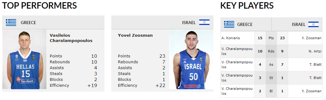 Ο Βασίλης Χαραλαμπόπουλος τελείωσε το παιχνίδι με double-double και ήταν παντού κυριολεκτικά, καθώς ηγήθηκε της ομάδας σε όλες τις κατηγορίες εκτός από το σκοράρισμα. Στην άμυνα είχε 3 κλεψίματα και 2 μπλοκ ενώ στην επίθεση μπορεί να μην ήταν στην καλύτερη του μέρα αλλά το κρίσιμο τρίποντο στο τέλος του πρώτου ημιχρόνου έδωσε φτερά στα πόδια των συμπαικτών του. Καθοριστικής σημασίας ήταν και τα 9 αμυντικά rebound από τα οποία τα περισσότερα ήταν contested και δεν άφησαν τους παίκτες του Ισραήλ να εκδηλώσουν δεύτερες επιθέσεις, ιδίως στα κρίσιμα σημεία του παιχνιδιού που οι Ισραηλινοί μείωσαν στους 6 πόντους.