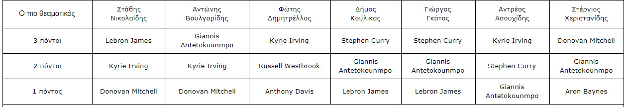 Οι υπόλοιποι: Giannis Antetokounmpo 10, Stephen Curry 8, Lebron James 5, Donovan Mitchell 5, Russell Westbrook 2, Anthony Davis 1, Aron Baynes 1