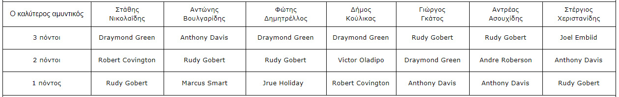 Οι υπόλοιποι: Draymond Green 11, Anthony Davis 7, Robert Covington 3, Joel Embiid 3, Victor Oladipo 2, Andre Roberson 2, Marcus Smart 1, Jrue Holiday 1