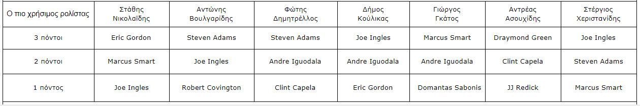 Οι υπόλοιποι: Steven Adams 8, Andre Iguodala 6, Marcus Smart 6, Eric Gordon 4, Draymond Green 3, Clint Capela 3, Robert Covington 1, JJ Redick 1, Domantas Sabonis 1