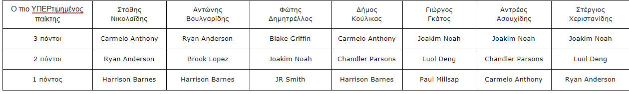 Οι υπόλοιποι: Carmelo Anthony 7, Ryan Anderson 6, Chandler Parson 4, Luol Deng 4, Blake Griffin 3, Harrison Barnes 3, Brook Lopez 2, JR Smith 1, Paul Millsap 1
