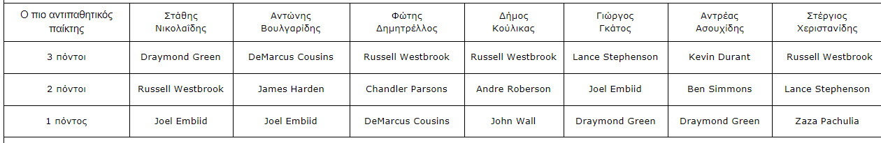 Οι υπόλοιποι: Draymond Green 5, Lance Stephenson 5, DeMarcus Cousins 4, Joel Embiid 4, Kevin Durant 3, James Harden 2, Chandler Parson 2, Andre Roberson 2, Ben Simmons 2, John Wall 1, Zaza Pachulia 1