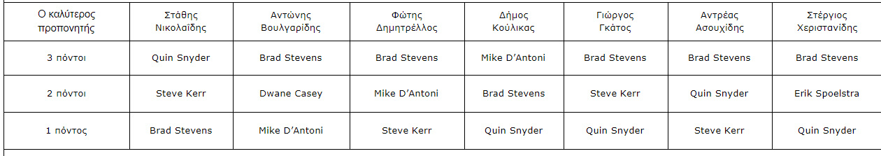 Οι υπόλοιποι: Quin Snyder 8, Mike D’Antoni 6, Steve Kerr 6, Erik Spoelstra 2, Dwane Casey 2