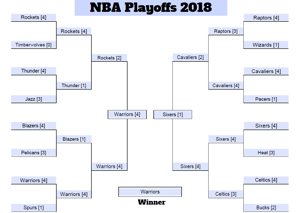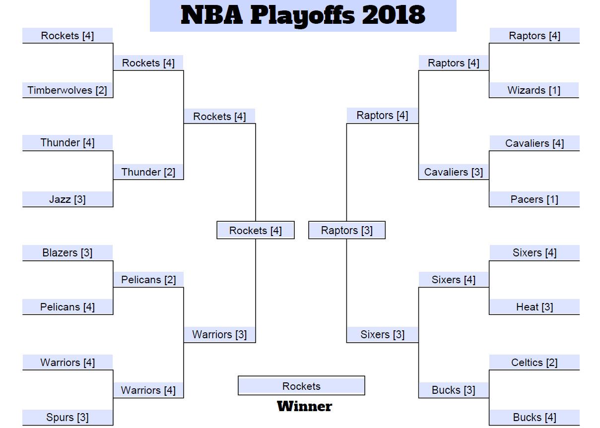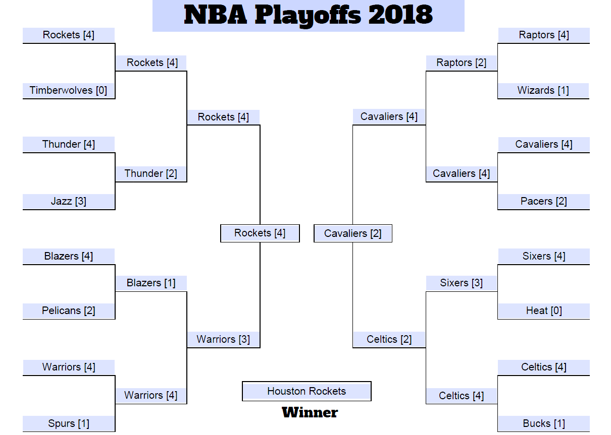 Οι first seeded Raptors παρακάμπτουν εύκολα την αντίσταση των μπερδεμένων μετά την επάνοδο του John Wall Wizards και πέφτουν πάνω στους φορμαρισμένους Cavs, όπου νωρίτερα είχαν σκουπίσει με συνοπτικές διαδικασίες τους Pacers. Το ίδιο περίπου κάνουν και στους δύσμοιρους Καναδούς που τους έχουν του «χεριού» τους. Τελικό περιφέρειας αντιμετωπίζουν την overachievers Sixers, που φτάνουν δύο νίκες μακριά απ’ τους Τελικούς αλλά δεν έχουν την απαιτούμενη εμπειρία και τρόπο αντιμετώπισης για τον Lebron και την παρέα του. Στην τελείως random φέτος Δύση είναι δύσκολο να κάνει κάποιος προβλέψεις, αλλά αυτό που είναι αδιαμφισβήτητο είναι η πλήρης ανωτερότητα των Rockets έναντι των T’wolves και του νικητή του ζευγαριού Jazz – Thunder (πρόκριση Jazz με γρανιτένια άμυνα, ξύλο της αρκούδας, Mitchell και chocking Paul George/Melo, αφήνοντας στα κρύα του λουτρού τον συγκινητικό Westbrook). Εκεί θα βρουν τους αναζωογονημένους από τη λήξη της κανονικής περιόδου Warriors, που μετά την τρομάρα που πήραν κόντρα στους Spurs, παρακάμπτουν πιο εύκολα το εμπόδιο των Blazers που έχουν «ταβανιάσει» μετά τη σκληρή μάχη με τους Pelicans. Δεν καταφέρνουν πάραυτα να κοντράρουν τους Rockets εξαιτίας της κατάστασης υγείας του Curry που για άλλη μια χρονιά δεν παίζει στο 100% στα playoffs. Οι Rockets όχι που θα ντραπούν και στους Τελικούς με περίσσεια αυτοπεποίθηση κερδίζουν τους Cavs σε έξι παιχνίδια με τον Chris Paul να αναδεικνύεται MVP και να βουλώνει τα στόματα των haters που υποστήριζαν πως δεν μπορεί να επιβληθεί στα Playoffs.